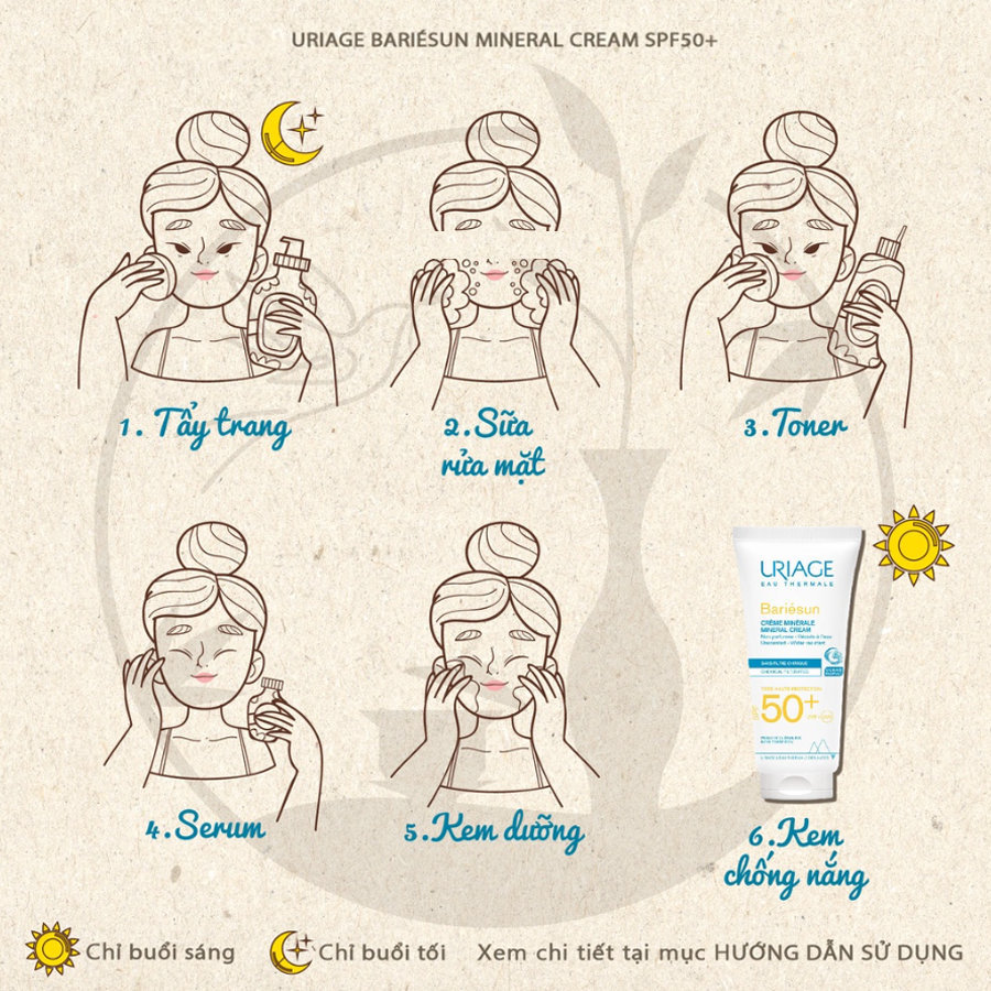 Sử dụng kem chống nắng Uriage Bariesun Mineral Cream SPF50+ đều đặn mỗi ngày như bước sau cùng trong chu trình dưỡng da buổi sáng. Lắc đều lọ kem chống nắng trước khi sử dụng.